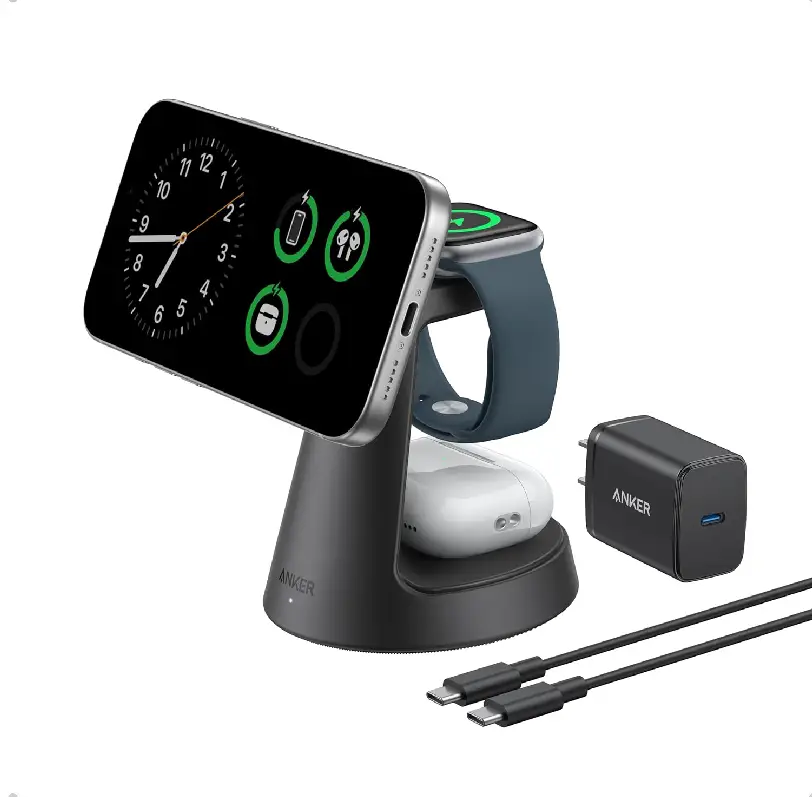 Charge multiple Apple devices effortlessly with the Anker MagGo 3-in-1 Charging Station, featuring MagSafe compatibility and 15W Qi2 certified fast magnetic wireless charging. Compact nano charging stand design keeps your iPhone, AirPods, and Apple Watch powered and organized—perfect for home or office use.