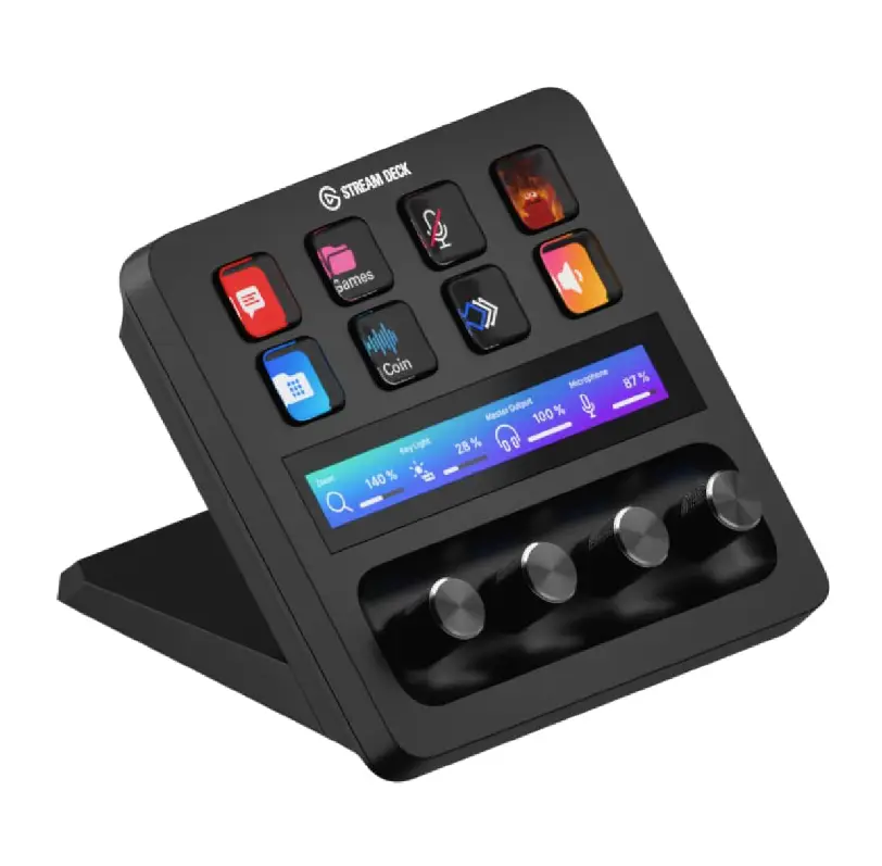 Advanced studio controller combining audio mixer and customizable touch buttons. Designed for gaming, streaming, and content creation to enhance production quality and workflow efficiency.