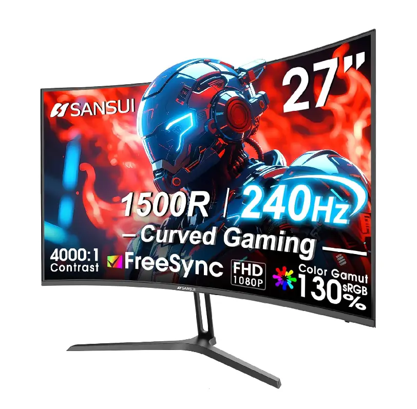 27-inch curved gaming monitor with 240Hz refresh rate, Full HD 1080p resolution, 1500R curvature, 130% sRGB, HDR support, FreeSync technology, and 1ms response time. Ideal for immersive, smooth gaming.
